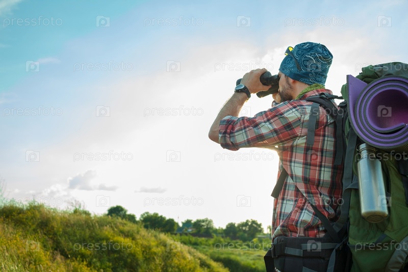 Мужчина с рюкзаком смотрит в бинокль