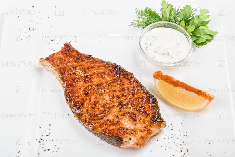 Жареная рыба с соусом, лимоном и зеленью на белой тарелке