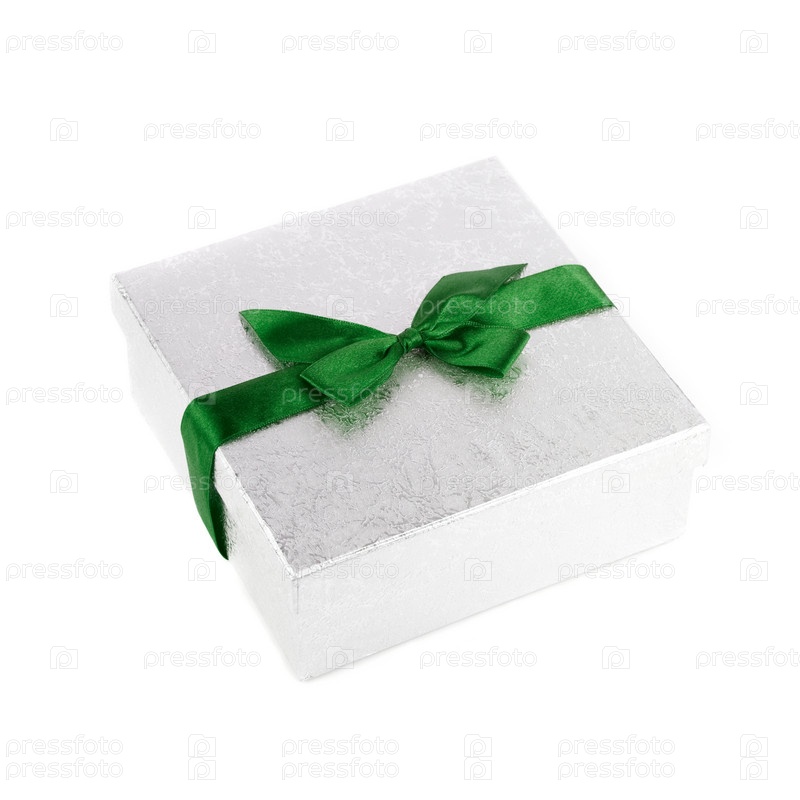 Коробка с зеленой ленточкой и бантом на белом фоне