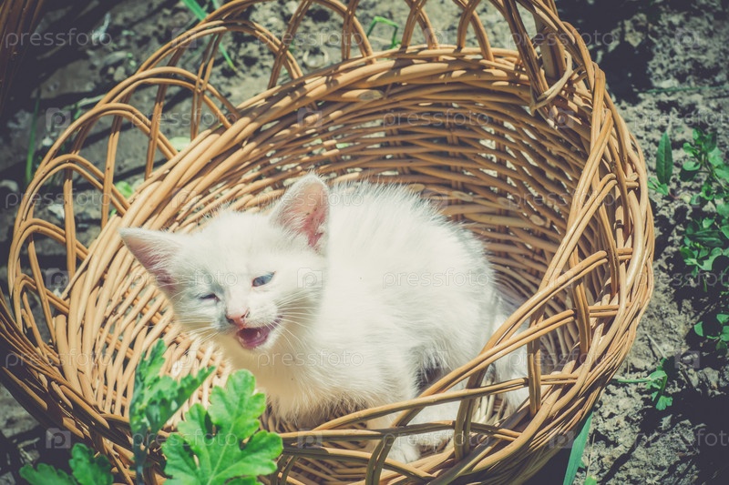 Белый котенок в корзине ретро