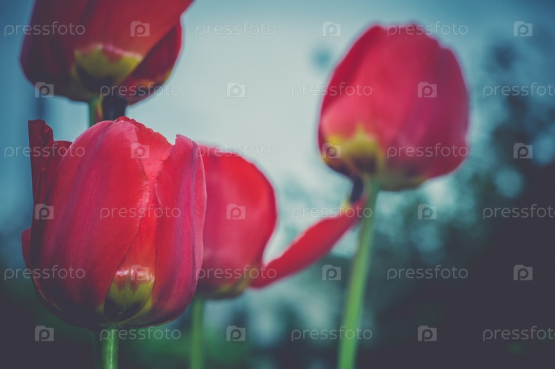 Красные тюльпаны в саду ретро