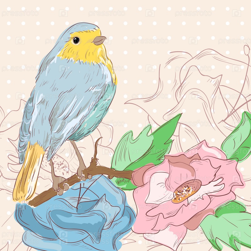Векторная иллюстрация птиц, сидя на ветке с цветами