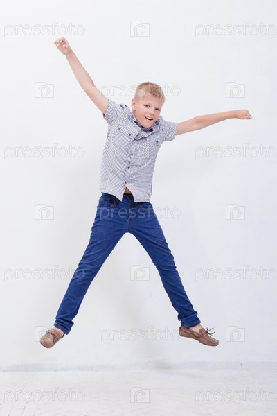 Счастливый мальчик прыгает на белом фоне