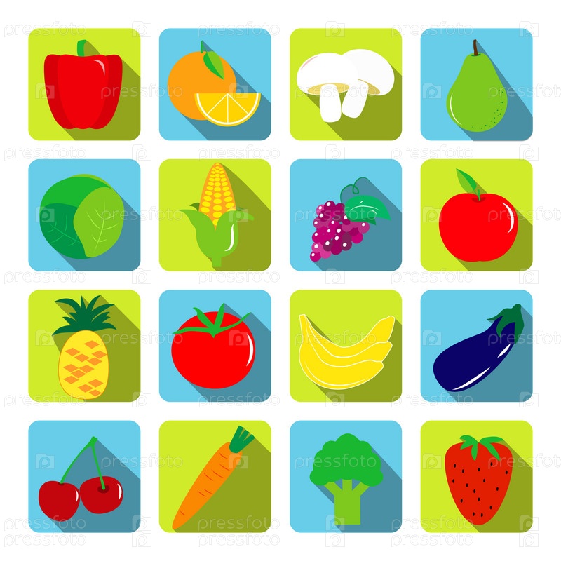 Овощи и фрукты векторные иконки с длинными тенями в плоский