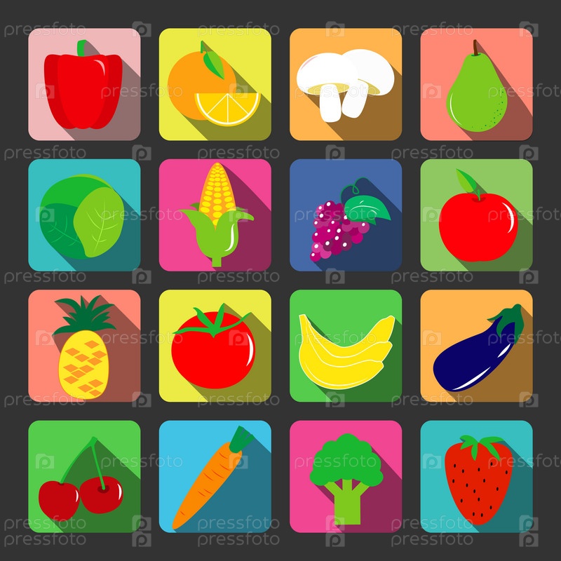 Овощи и фрукты векторные иконки с длинными тенями в плоский