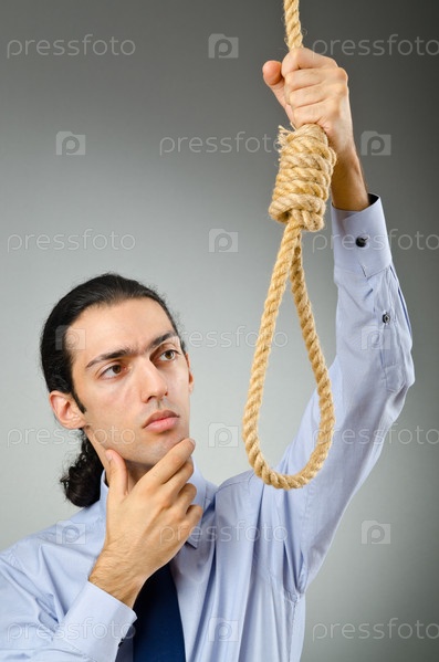 Бизнесмен держит веревку с петлей и думает о самоубийстве, серый фон