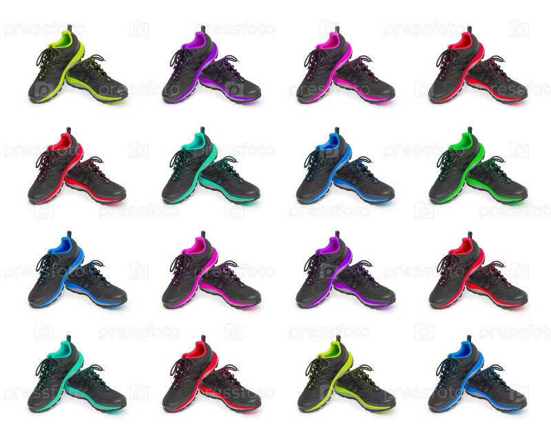Коллаж кроссовки, изолированные на белом фоне