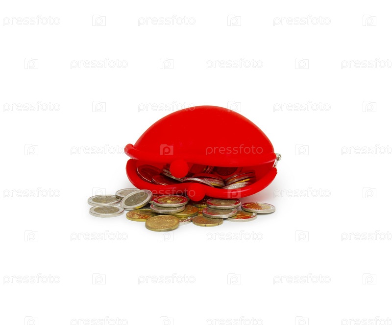 Красный кошелек и монеты на белом фоне