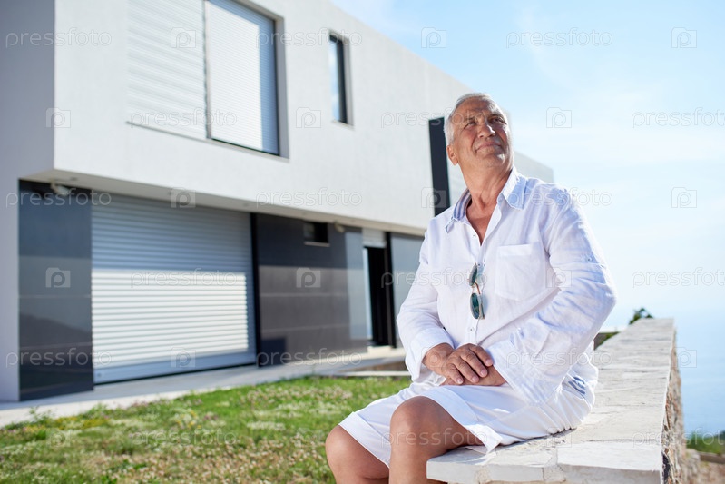 Старший мужчина напротив современного дома