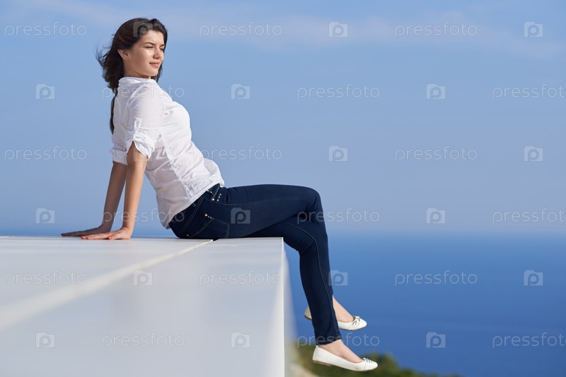 Женщина перед современным домом