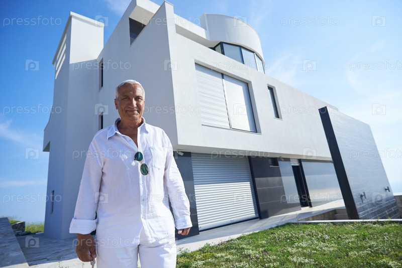 Старший мужчина напротив современного дома