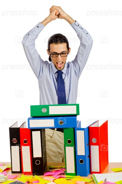 Эмоциональный бизнесмен стоит над столом с документами, белый фон