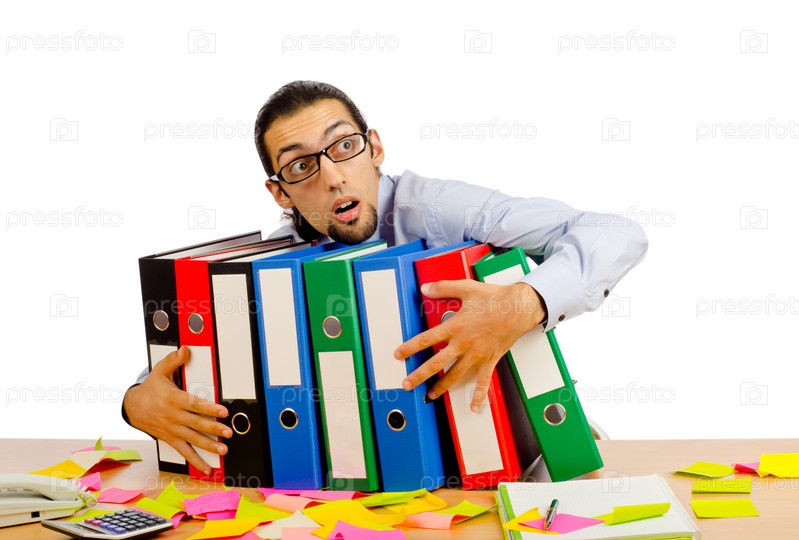 Испуганный бизнесмен сидит за столом с документами, белый фон