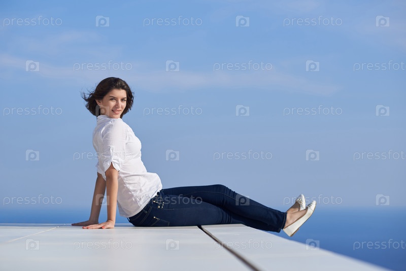 Расслабленной женщина перед роскошь современного дома