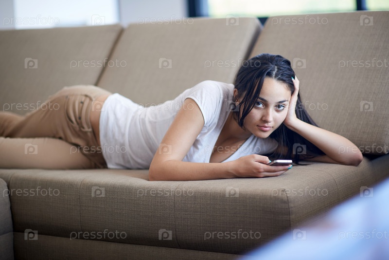 Молодая женщина, используя сотовый телефон дома