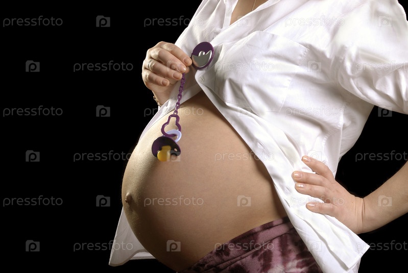 Живот беременной женщины, держащей соску, на черном фоне