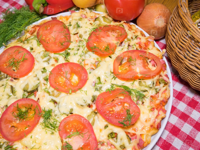 Мясная пицца с помидорами