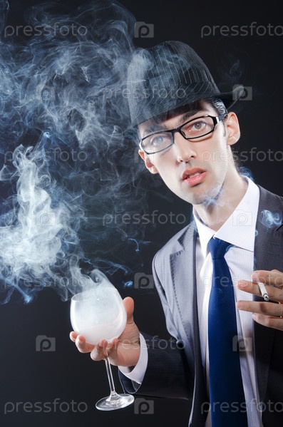Молодой человек с сигаретой и бокалом в дыму