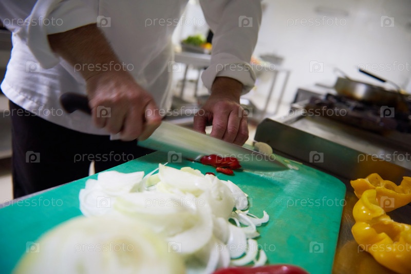 Шеф-повар в отеле кухня кусочек овощей с ножом