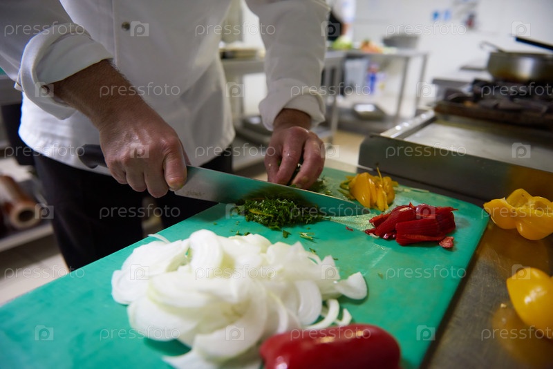 Шеф-повар в отеле кухня кусочек овощей с ножом