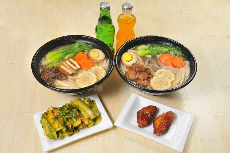 Две миски лапши и гарниры