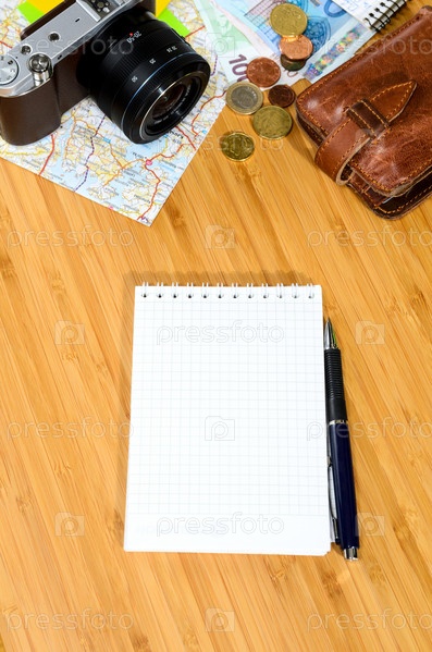 Готовясь к путешествия, деньги, карта и фото камера на деревянном столе