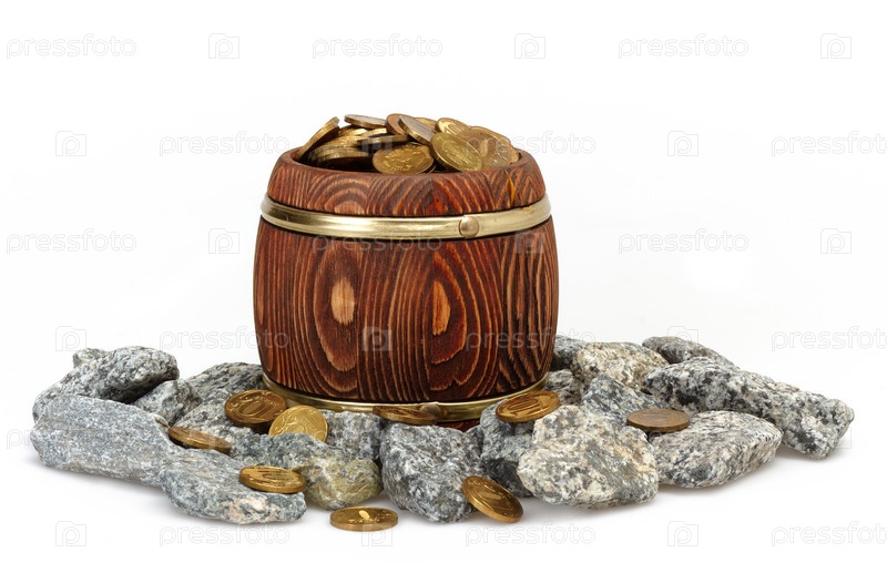 Старая бочка с золотыми монетами среди камней на белом фоне