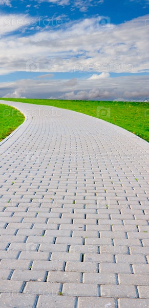 Кирпичная дорожка среди газонов уходит вдаль