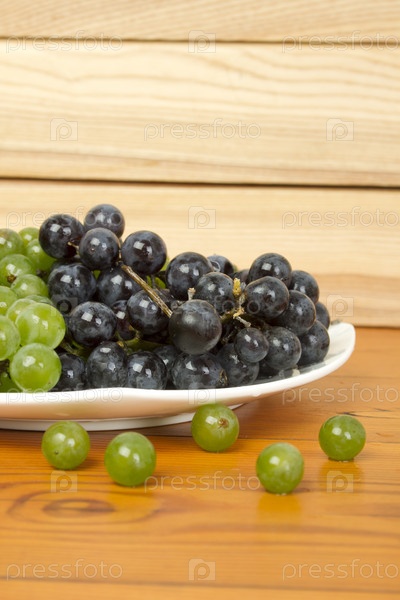 Зеленый и черный виноград на белой тарелке
