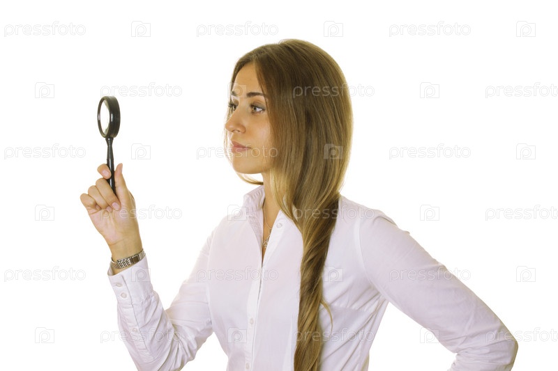 Деловая леди смотрит сквозь увеличительное стекло, изолирована на белом фоне