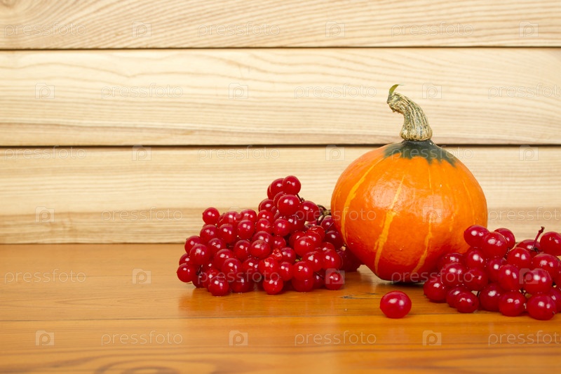 Тыква и клюква на деревянном столе