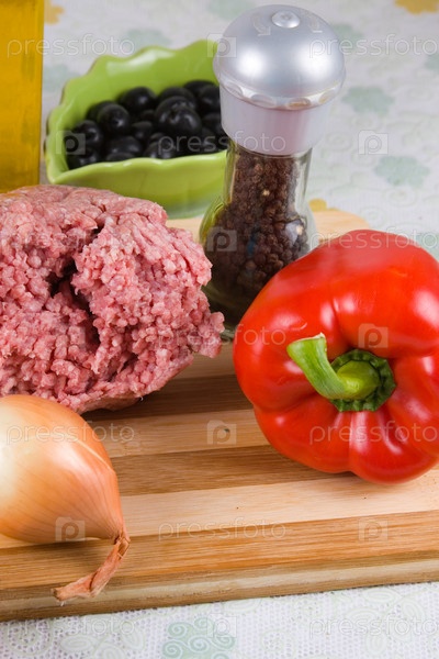 Свежий мясной фарш, овощи и специи на столе