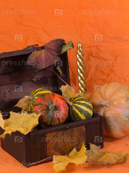 Разноцветные тыквы в сундуке на оранжевом фоне