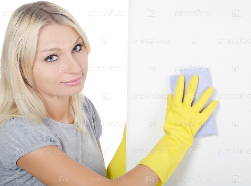 Молодая девушка, занимающаяся уборкой на белом фоне
