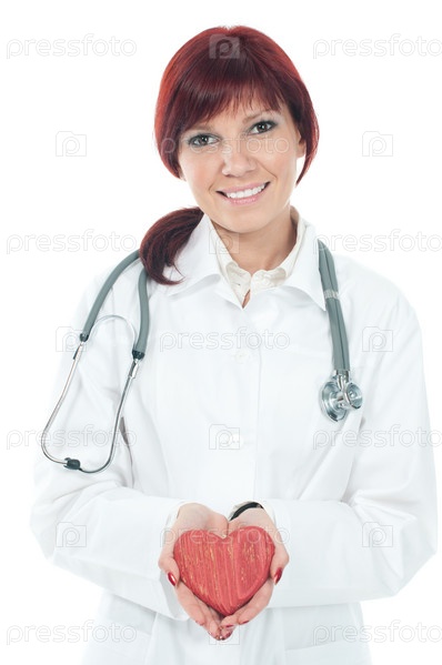 Молодая приветливая врач-кардиолог с деревянным сердечком в руках, белый фон