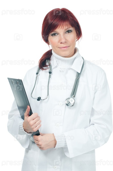 Молодая женщина-врач в медицинском халате со стетоскопом и планшетом на белом фоне