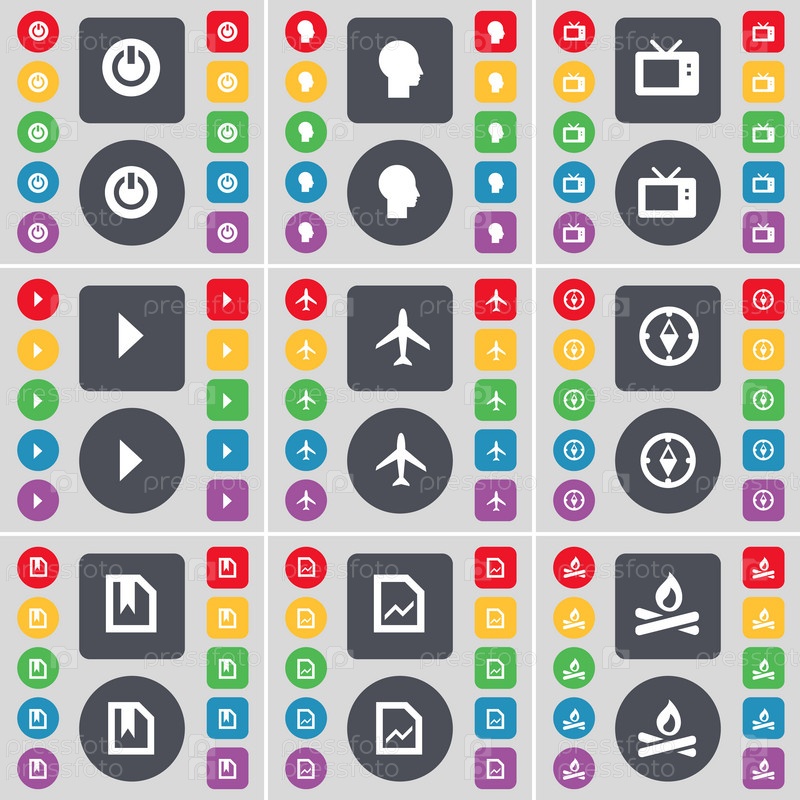 Мощность, силуэт, Ретро ТВ, средства массовой информации играют, самолет, компас, файл, граф, костра значок символа. Большой набор плоских, цветные кнопки для вашего дизайна. Вектор