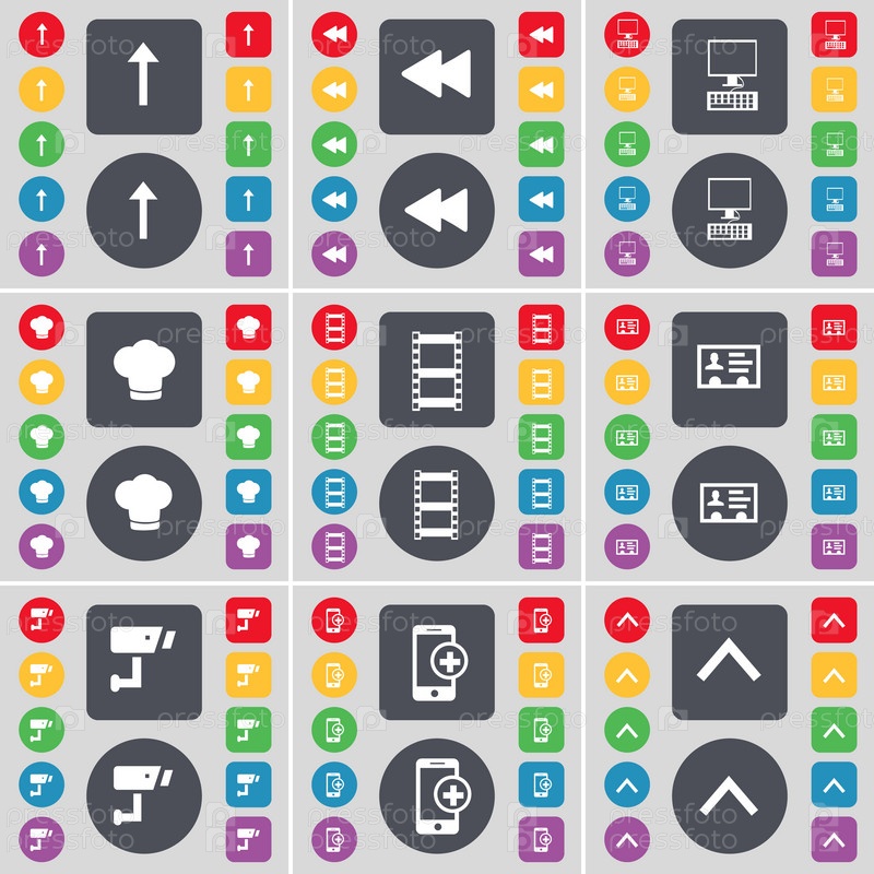 Стрелка вверх, ревинд, ПК, приготовление шляпы, негативные пленки, контакт, иконка символа CCTV. Большой набор плоских цветных кнопок для вашего дизайна. вектор