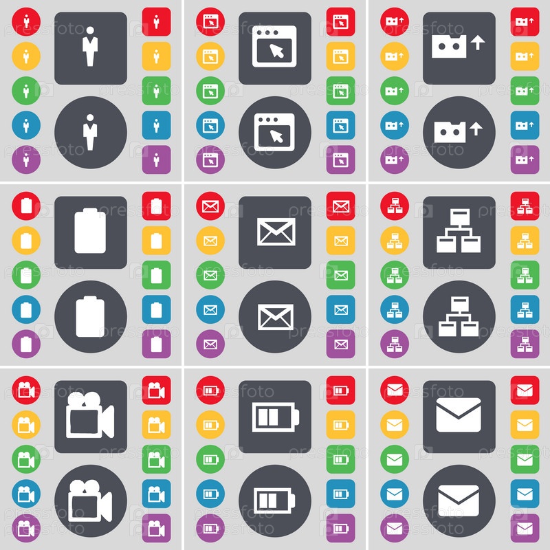 Силуэт, окна, кассеты, батарея, сообщение, сеть, фильм камеры значок символа. Большой набор плоских, цветные кнопки для вашего дизайна. Вектор