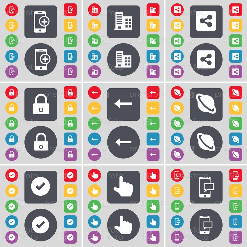 Смартфон, здание, доля, замок, стрелка влево, планета, точка, рука, символ значка SMS. Большой набор плоских цветных кнопок для вашего дизайна. вектор