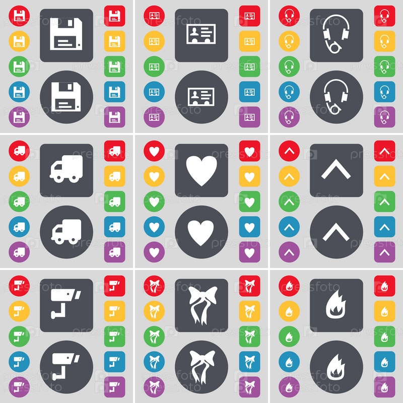 Флопы, контактные устройства, наушники, грузовик, сердце, стрелка вверх, CCTV, лук, значок символа.Большой набор плоских цветных кнопок для вашего дизайна.Вектор