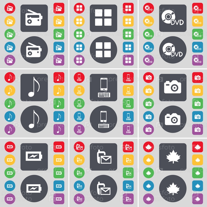 Радио, приложения, DVD, примечание, смартфон, камера, зарядка, SMS, клен значок символа. большой набор плоских цветных кнопок для вашего дизайна. вектор