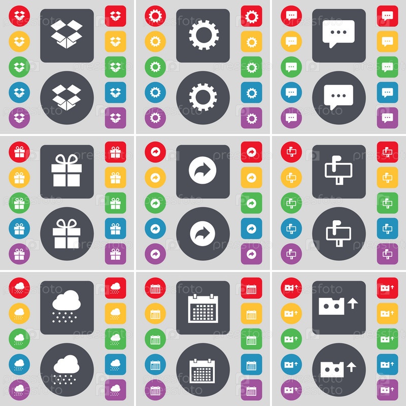 Dropbox, оборудование, чат-пузырь, подарок, обратно, почтовый ящик, облако, календарь, кассета значок символа. большой набор плоских цветных кнопок для вашего дизайна. вектор