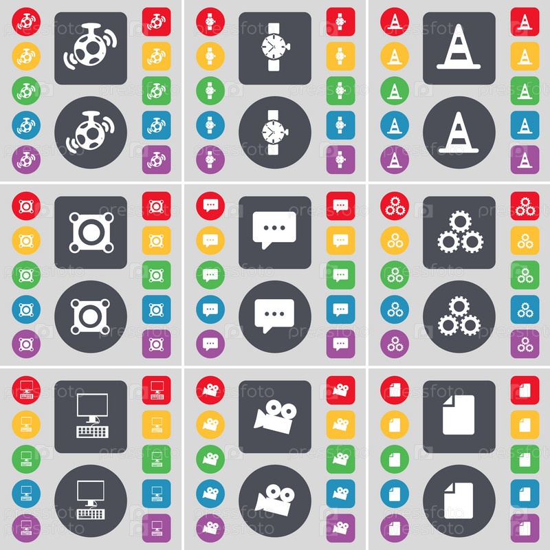 Спикер, наручные часы, конус, спикер, пузырь для чата, Гир, ПК, пленочная камера, символ файла иконки. большой набор плоских цветных кнопок для вашего дизайна. вектор