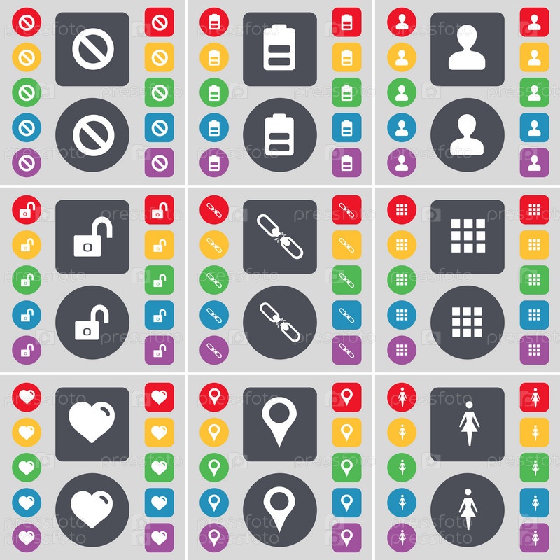 Стоп, батарея, аватар, замок, ссылка, приложения, сердце, контрольно-пропускной пункт, символ значка Silh. большой набор плоских цветных кнопок для вашего дизайна. вектор