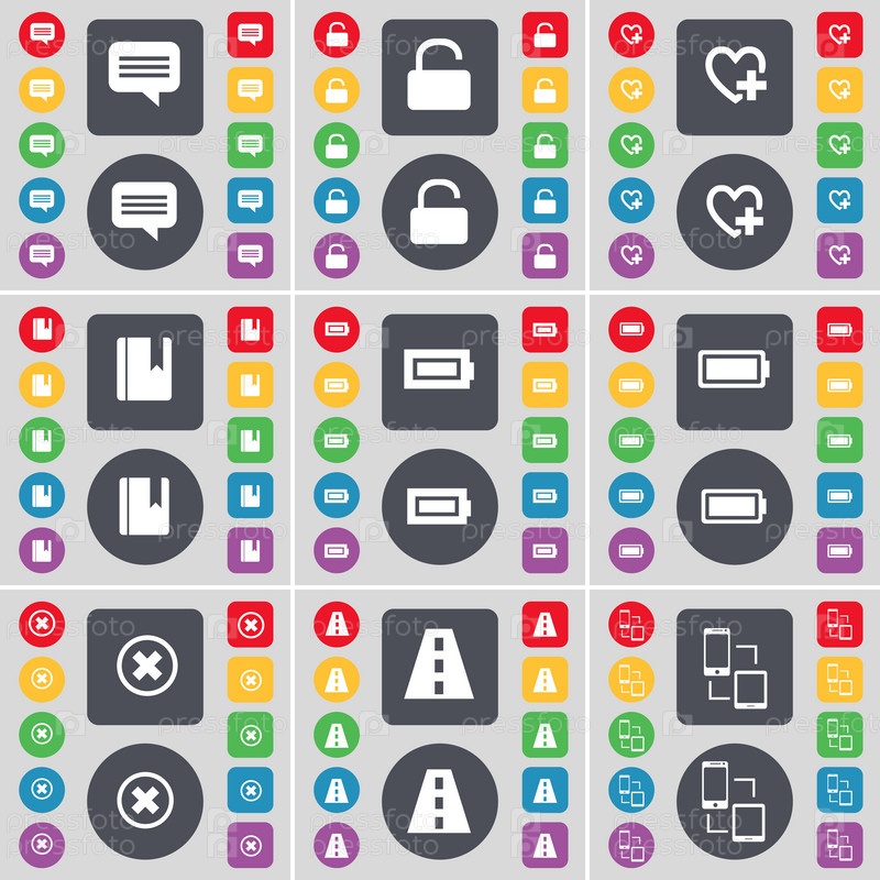 Чат пузырь, замок, сердце, словарь, батарея, стоп, дорога, символ значок подключения. Большой набор плоских, цветные кнопки для вашего дизайна. Вектор