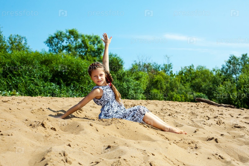 Милая маленькая девочка на песочном берегу