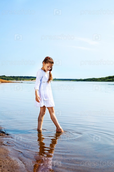 Милая маленькая девочка зашла в воду