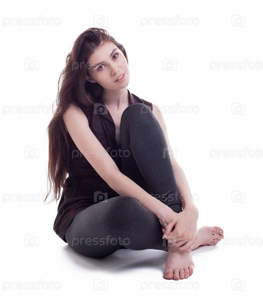 Красивая брюнетка с длинными волосами сидит в студии