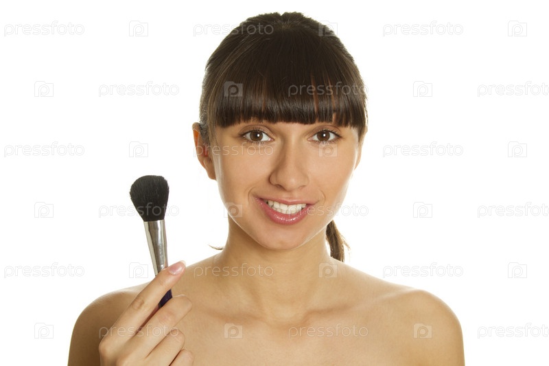 Привлекательная девушка с косметической кисточкой на белом фоне